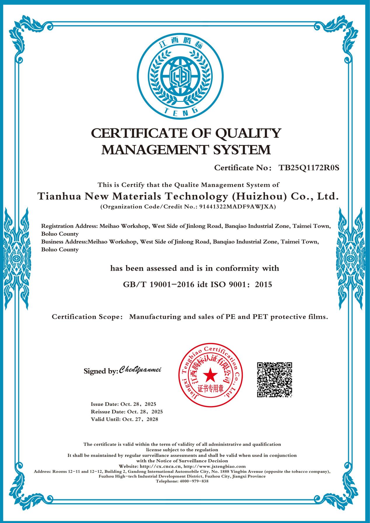 下一篇:惠州天华-质量管理体系认证证书(中文)